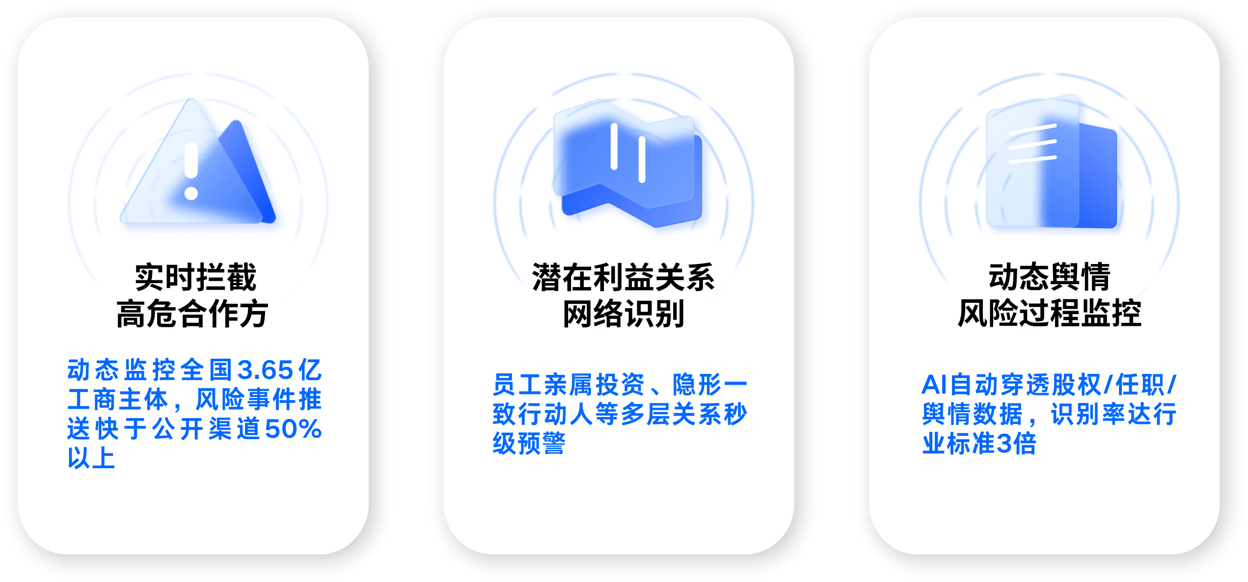 企查查第三方风险排查系统,专为采购、财务、风控、合规、内控部门打造。围绕供应商准入排查、风险监控、围串标管理、利益冲突排查、供应商年检等业务应用,为客户提供全链路数字化尽调,穿透深层主体关系识别隐性利益链,感知外部风险实时拦截告警企业,满足采购风控合规全流程管理。