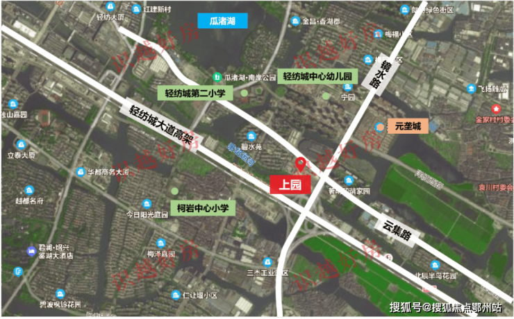 上园位于瓜渚湖板块——柯桥区镜水路与云集路交叉口,近享约 2万方商业综合体元垄天空MALL(在建),轻纺城中心幼儿园、轻纺城第二小学、鲁迅外国语学院等教育资源环伺,居住氛围浓厚。